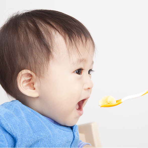 離乳食は赤ちゃんのぺースで進めましょう。母乳やミルクといった乳汁中心の乳児食から幼児食(固形食)にスムーズに移行するために、さまざまな食材から栄養が摂れるようになる練習をさせてあげるのが離乳食です。離乳食は赤ちゃんのペースで進めるのが原則ですが、おおよそ4 つの期間(下記の【離乳食進行早見表】参照)に分けることができます。始める時期は生後5、6 ヶ月頃、完了するのは12 ~ 18 ヶ月頃が目安です。